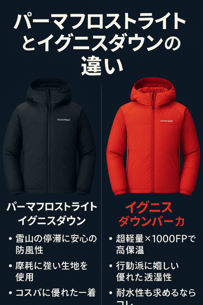【違いはここ】パーマフロストライト vs イグニス「防風一体」か「超軽量1000FP」か? モンベル最上級ダウン徹底比較
